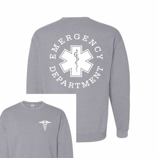 Emergency Department Crewneck Sweatshirt (LARGE BACK IMAGE) Left Chest Medical Caduceus