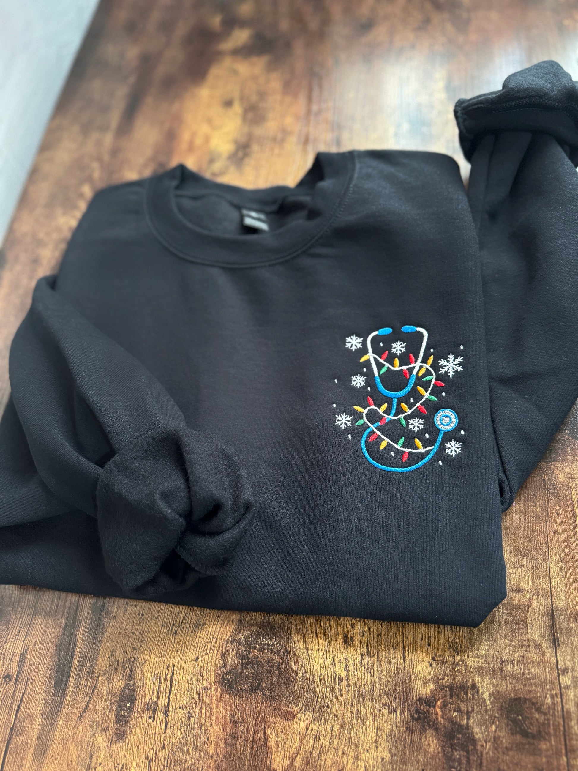 Embroidered Holiday Lights Stethoscope Crewneck Sweatshirt